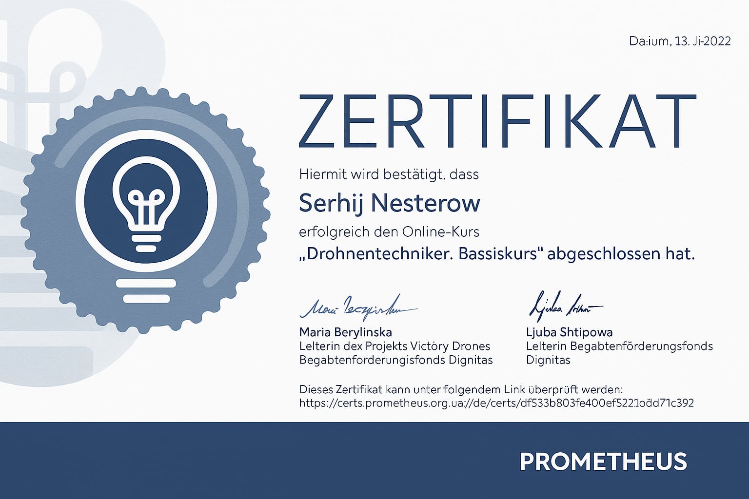 - Zertifikat als Ingenieur für Drohnenmontage